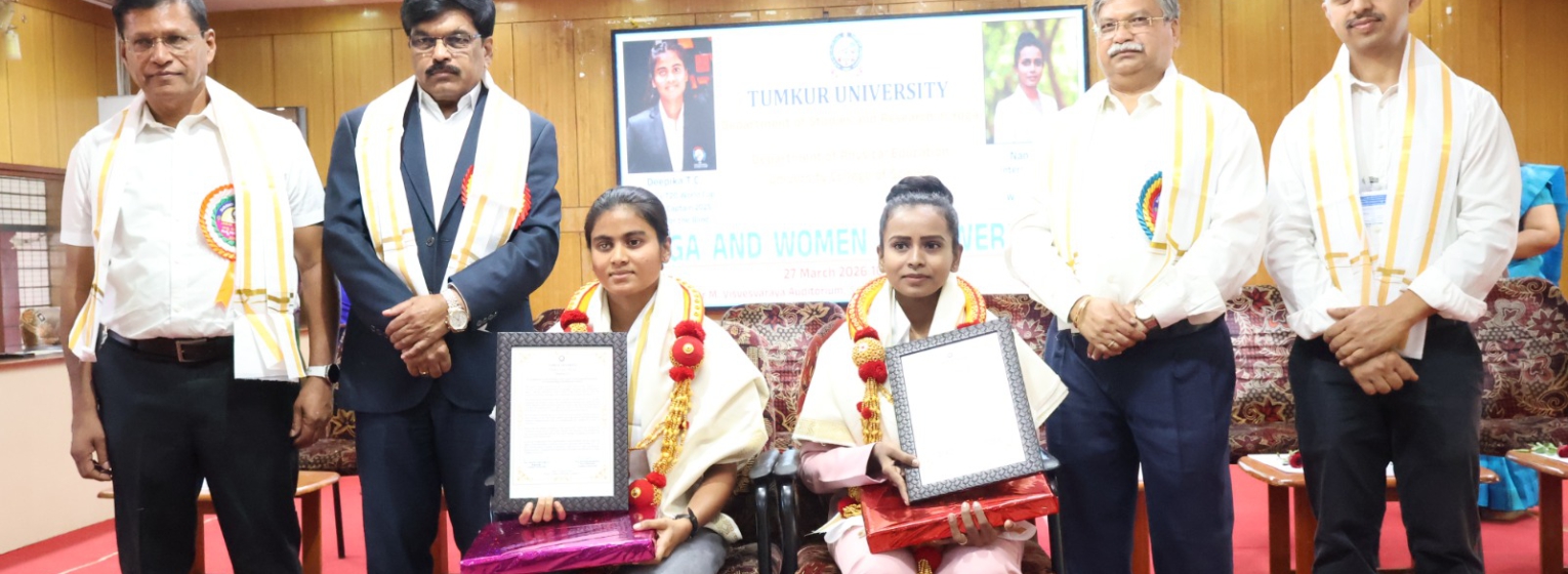 ತುಮಕೂರು ವಿಶ್ವವಿದ್ಯಾನಿಲಯದ ಯೋಗಾಧ್ಯಯನ ಮತ್ತು ಸಂಶೋಧನಾ ವಿಭಾಗ ಹಾಗೂ ವಿಶ್ವವಿದ್ಯಾನಿಲಯ ವಿಜ್ಞಾನ ಕಾಲೇಜಿನ ದೈಹಿಕ ಶಿಕ್ಷಣ ವಿಭಾಗದ ಸಹಯೋಗದಲ್ಲಿ ನಡೆದ ಯೋಗ ಮತ್ತು ಮಹಿಳಾ ಸಬಲೀಕರಣ ಕುರಿತ ಒಂದು ದಿನದ ರಾಷ್ಟಿçÃಯ ಸಮ್ಮೇಳನದಲ್ಲಿ ಮಹಿಳಾ ಅಂಧರ ಟಿ-೨೦ ವಿಶ್ವಕಪ್ ವಿಜೇತ ತಂಡದ ನಾಯಕಿ ಟಿ. ಸಿ. ದೀಪಿಕಾ, ಬೆಂಗಳೂರಿನ ಅಂತರಾಷ್ಟಿçÃಯ ಯೋಗ ಮತ್ತು ವೆಲ್ನೇಸ್ ತರಬೇತುದಾರರಾದ ನಂದಿನಿ ಎಸ್. ಪಿ. ಅವರನ್ನು ತುಮಕೂರು ವಿಶ್ವವಿದ್ಯಾನಿಲಯದ ಕುಲಪತಿ ಪ್ರೊ. ಎಂ. ವೆಂಕಟೇಶ್ವರಲು ಸನ್ಮಾನಿಸಿದರು. (27-03-2026)